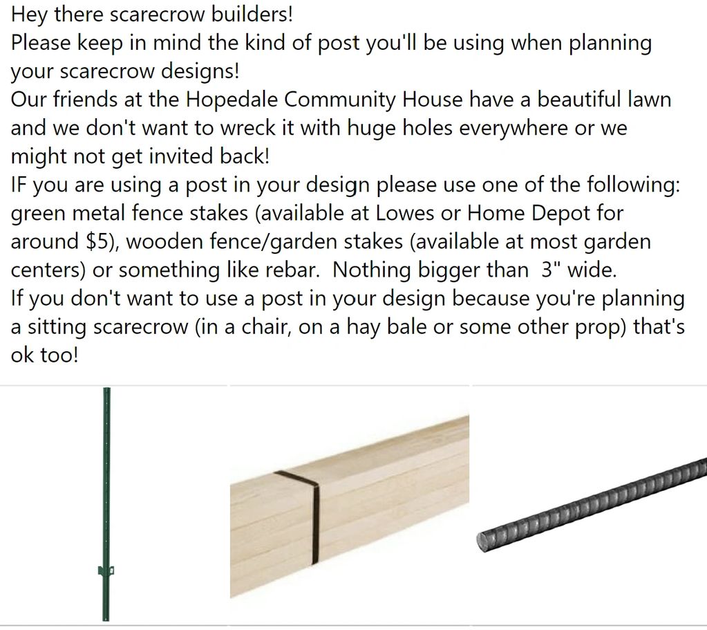 Do you want a prime spot for your scarecrow downtown? Spaces are available on the Hopedale Community House Lawn!